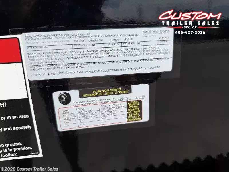 2026 LOAD TRAIL DL 14 X 83 TANDEM AXLE LOW PRO 14K HIGH SIDE BUMPER PULL DUMP 2 - 7K DEXTER ELECTRIC BRAKE SPRING AXLES 2 5/16" ADJUSTABLE COUPLER (6 HOLE) 10K SPRING LOADED DROP LEG JACK 8" X 13LB I-BEAM FRAME & TONGUE 16" CROSS MEMBERS SCISSOR HOIST W/ STANDARD PUMP 48" DUMP SIDES 2 WAY SPREADER GATE 10 GAUGE FLOOR E-Z LOCK MESH TARP SYSTEM W/ COVER WELD ON DIAMOND PLATE FENDERS REAR SLIDE IN RAMPS - 80" X 16" REAR SUPPORT STANDS (2" X 2" TUBING) 1 - 30" MAX-STEP 4 - 3" WELD-ON D-RINGS FRONT TONGUE MOUNT TOOL BOX (MAX-BOX W/ DIVIDER) LED LIGHTS COLD WEATHER HARNESS STANDARD BATTERY WALL CHARGER (5AMP) SPARE MOUNT BLACK STEEL WHEELS 235/80R/16 10 PLY TIRES 4ZEDT1423T2371894 POWDER COATED BLACK WEIGHT - 4,269LBS GVWR - 14,000LBS WARRANTY INFO: 2 YEAR COMPREHENSIVE LIMITED WARRANTY 3 YEAR STRUCTURAL 2 YEAR ROAD SIDE ASSISTANCE - Road Service Program 903-783-3933 for Info. CUSTOM TRAILER SALES 8005 NE 23RD STREET OKLAHOMA CITY, OK 73141 CALL OR TEXT: 405-427-3036 CUSTOMTRAILERSALES.COM HOURS MONDAY-FRIDAY: 8AM-5PM CLOSED SATURDAY - Available by Appointment CLOSED SUNDAY CALL OR TEXT: 405-427-3036 CUSTOMTRAILERSALES.COM FINANCE OPTIONS AVAILABLE Rent-to-Own (ALL CREDIT APPROVED) Clicklease Sheffield Financial Synchrony Trailer Solutions Financial Apply for financing online at customtrailersales.com/financing WE STRIVE TO ENSURE ALL PRICING & INFORMATION CONTAINED IN THIS AD IS ACCURATE. DEALER RESERVES THE RIGHT TO REFUSE ANY SALE DUE TO PRICING ERRORS AND WILL NOT BE HELD RESPONSIBLE FOR ANY ERRORS RESULTING FROM TYPOS, INACCURATE DETAIL INFORMATION OR TECHNICAL MISTAKES. WE RESERVE THE RIGHT TO CORRECT ANY PRICING ERRORS AT ANY TIME. INVENTORY IS CONSTANTLY CHANGING - CALL BEFORE YOU COME TO GUARANTEE AVAILABILITY.