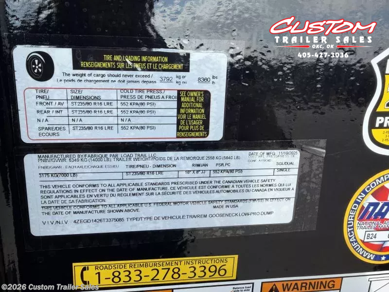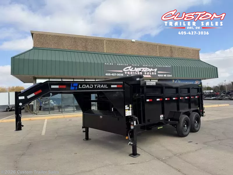 2026 LOAD TRAIL GD 14 X 83 TANDEM AXLE 14K HIGH SIDE GOOSENECK DUMP W/ TELESCOPIC CYLINDER 2 - 7K DEXTER ELECTRIC BRAKE SPRING AXLES 2 5/16" ROUND ADJUSTABLE COUPLER DUAL 10K SPRING LOADED DROP LEG JACKS 8" I-BEAM FRAME 10" I-BEAM NECK 16" CROSS MEMBERS TELESCOPIC CYLINDER 48" DUMP SIDES 2 WAY SPREADER GATE 10 GAUGE FLOOR TARP KIT WELD ON DIAMOND PLATE FENDERS REAR SLIDE IN RAMPS - 80" X 16" REAR SUPPORT STANDS (2" X 2" TUBING) 4 - 3" WELD-ON D-RINGS FRONT TOOL BOX (FULL WIDTH BETWEEN RISERS) LED LIGHTS COLD WEATHER HARNESS STANDARD BATTERY WALL CHARGER (5 AMP) 1 - 30" MAX-STEP SPARE TIRE BLACK STEEL WHEELS 235/80R/16 10 PLY TIRES 4ZEGD1426T3375085 POWDER COATED BLACK WEIGHT - 4,980LBS GVWR - 14,000LBS WARRANTY INFO: 2 YEAR COMPREHENSIVE LIMITED WARRANTY 3 YEAR STRUCTURAL 2 YEAR ROAD SIDE ASSISTANCE - Road Service Program 903-783-3933 for Info. CUSTOM TRAILER SALES 8005 NE 23RD STREET OKLAHOMA CITY, OK 73141 CALL OR TEXT: 405-427-3036 CUSTOMTRAILERSALES.COM HOURS MONDAY-FRIDAY: 8AM-5PM CLOSED SATURDAY - Available by Appointment CLOSED SUNDAY CALL OR TEXT: 405-427-3036 CUSTOMTRAILERSALES.COM FINANCE OPTIONS AVAILABLE Rent-to-Own (ALL CREDIT APPROVED) Clicklease Sheffield Financial Synchrony Trailer Solutions Financial Apply for financing online at customtrailersales.com/financing WE STRIVE TO ENSURE ALL PRICING & INFORMATION CONTAINED IN THIS AD IS ACCURATE. DEALER RESERVES THE RIGHT TO REFUSE ANY SALE DUE TO PRICING ERRORS AND WILL NOT BE HELD RESPONSIBLE FOR ANY ERRORS RESULTING FROM TYPOS, INACCURATE DETAIL INFORMATION OR TECHNICAL MISTAKES. WE RESERVE THE RIGHT TO CORRECT ANY PRICING ERRORS AT ANY TIME. INVENTORY IS CONSTANTLY CHANGING - CALL BEFORE YOU COME TO GUARANTEE AVAILABILITY.